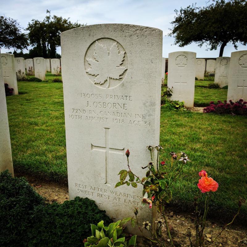 As part of the reseach, I was discussing my findings with family. After a conversation, I found he died in the Battle of Amiens. This gave me a date to go along with his full name. With those two bits of information, I found his resting place through an online grave index. Amazingly, his record had the address he lived at in Vancouver. I cross referenced this with marriage records of my Grandaunt, which had that same address. 100% this was my Great Grandfather. He is buried in a small town outside of Amiens.